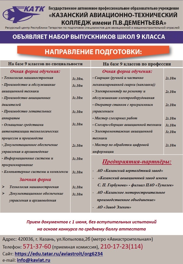 ГАПОУ "Казанский авиционно-технический колледж имени П.В.Дементьева" приглашает учеников 8-9 классов на профориентационное мероприятие, которое состоится 10 апреля 2021 года в 10.00 час.
