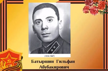 10 в класс снял видесюжет про улицу Батыршина.Батыршин Гильфан Абубакирович (1914-1947), Герой Советского Союза. Батыршин (Батаршин) Гильфан Абубакирович (Абубекерович) – первый Герой Советского Союза из татар, родился 1 января 1914 г. в семье шахтера в поселке Голубовка (ныне г. Кировск на Украине). Детство его прошло в Донбассе.В 1941 г. он окончил Военную академию им. Фрунзе и вновь служил в пограничных войсках. Участвуя в Великой Отечественной войне, майор Батыршин был награжден орденами Ленина, Отечественной войны I степени, Красной Звезды и медалями. Гильфан Абубакирович очень любил Казань и использовал любую возможность, чтобы посетить наш город. Хранят добрую память о герое и казанцы. В 1973 г. улица Столбовая, расположенная в Кировском районе Казани, была названа именем Г.А. Батыршина. -