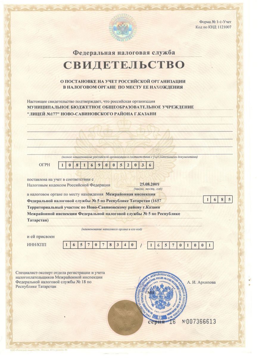 - Свидетельство о постановке на учет в российской организации в налоговом органе