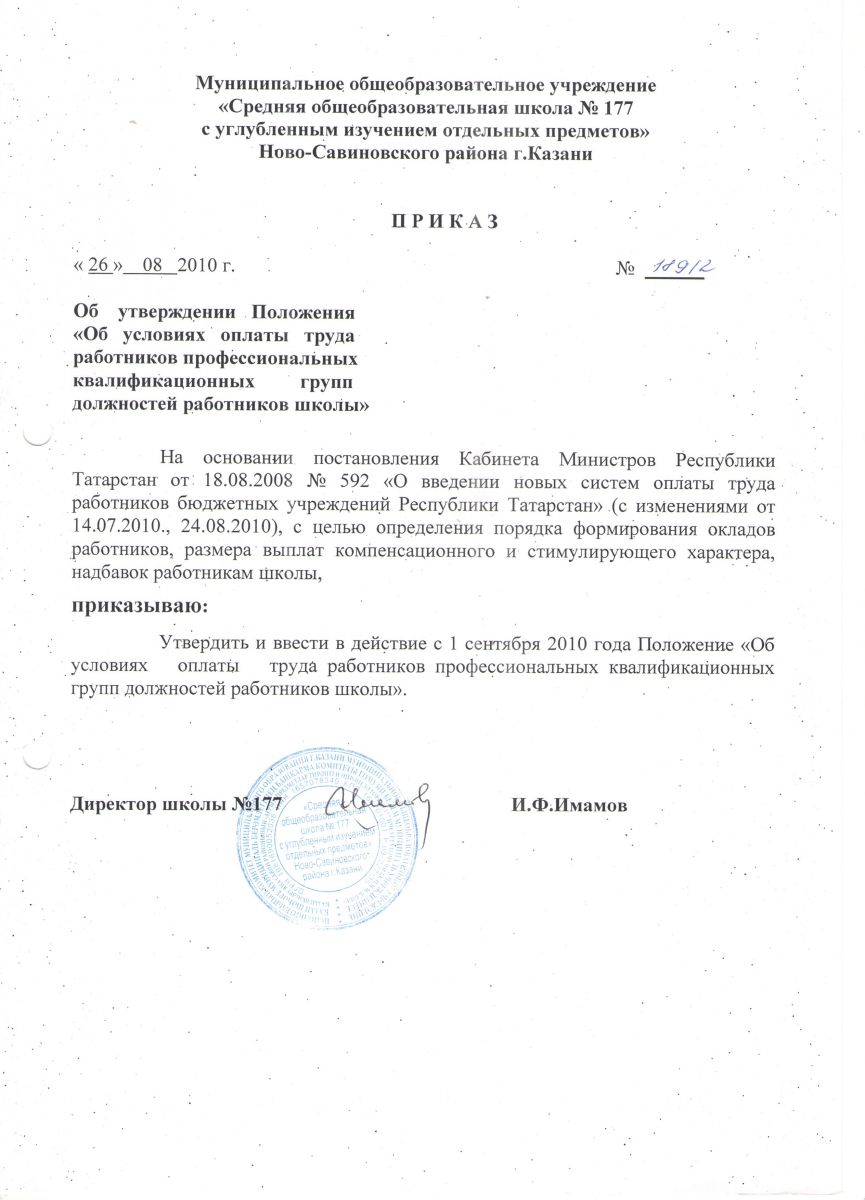 - Приказ об утверждении положения "Об условиях оплаты труда работников профессиональных квалификационных групп должностей работников школы"