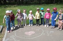 Среди воспитанников средних и старшей групп был проведён конкурс строя и песни "Юные защитники России". А малыши рисовали тематические рисунки мелом на асфальте.