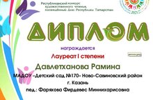 Диплом I степени Республиканского конкурса детского творчества "Новогодняя звезда" в номинации "Художественное слово". Поздравляем нашу Ралину и педагога Фирдаус Харисовну за подготовку.