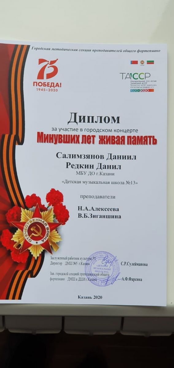 Опубликовано: 15.03.2020Поздравляем Салимзянова Даниила и Редкина Данила с получением диплома за участие в городском концерте "Минувших лет живая память". Преподаватель - Алексеева Н.А, Зиганшина В.Б.