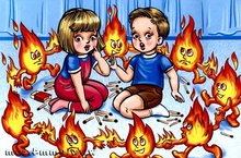 В нестандартной ситуации ребенок не можетвести себя адекватно, в виду своего малолетнего возраста, тем более если ему не рассказывали что нужно делать в той или иной ситуации.Поэтому при возникновении пожара они начинают совершать неправильные действия, например прятаться под кроватью или в шкафу или же при возгорании на них одежды, начинают бегать, думая, что огонь погаснет, хотя этого категорически делать не нужно. В этом случае сразу же необходимо скинуть одежду или же упав на землю, нужно чтобы кто-нибудь накинул на горящую одежду плотную ткань, перекрыв тем самым доступ кислорода огню.