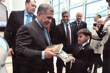 Ученик 3го класса нашей гимназии Рысаев Т. подарил президенту Республики Татарстан в подарок книгу "Бертуган Туйкиннар".