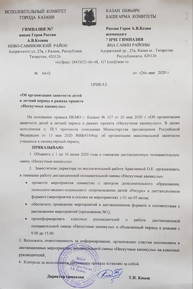 Приказ по гимназии "Нескучные каникулы"