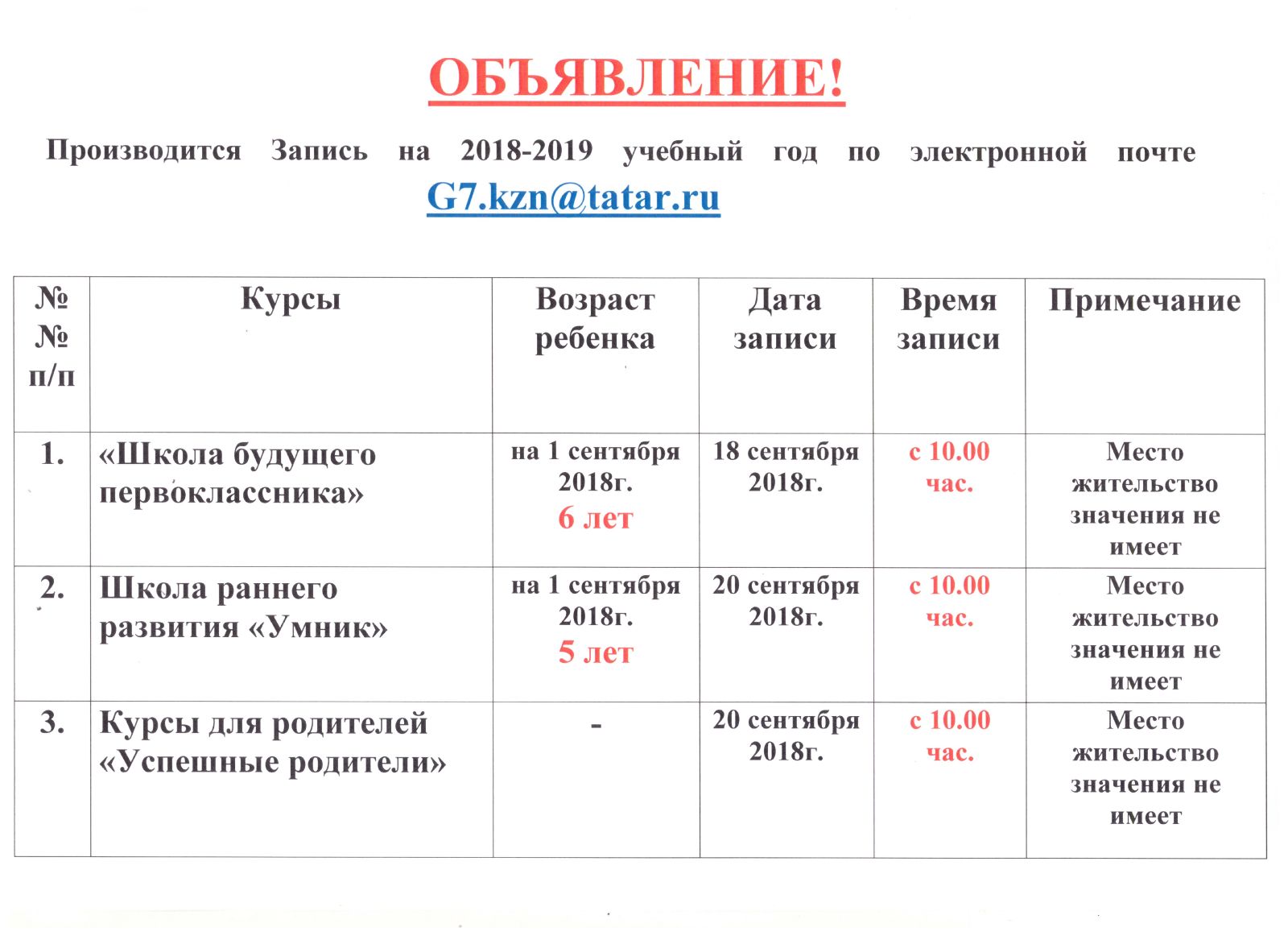 Запись на курсы исключительно в электронном варианте 18.09.2018 с 10 часов на адрес гимназии: G7.kzn@tatar.ru по форме: ФИО ребенка, дата рождения, домашний адрес (по прописке), ФИО одного из родителей, контактный телефон.