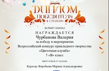 Поздравляем Валерию Чурбанову, ученицу 5В класса», с победой во Всероссийском конкурсе прикладного творчества «Цветочная клумба».
