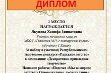 Учитель начальных классов Якупова Ханифа Зиннатовна в номинации «Декоративно-прикладное творчество» с поделкой «Мы за мирное детство!» заняла 2 место.