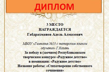 Ученик 4 класса Габдрахманов Адель Алмазович в номинации «Радужное детство» со стихотворением собственного сочинения занял 3 место. Руководитель Якупова Х.З.