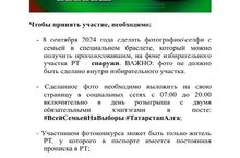 В рамках акции «Всей семьей на выборы» будет проводиться республиканский фотоконкурс #ВсейСемьейНаВыборы #ТатарстанАлга, приуроченного к году семьи-2024, который будет проходить в течение дня с 8 сентября 2024 года с 7.00 до 20.00. Принять участие и выиграть один из 12 смартфонов iPhone 15 и один автомобиль Lada Vesta может каждая семья Республики Татарстан!!!!