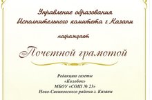 26 июня в День Молодежи на площади перед театром Г.Камала в торжественной обстановке прошло награждение коллективов школ. Редакция газеты "КОЛОБОК" для начальной школы под руководством Петровой Марии Сергеевны была награждена ПОЧЕТНОЙ ГРАМОТОЙ Управления образования Исполнительного комитета г. Казани за победу в номинации "Здоровье в твоих руках" городского конкурса детской и юношеской прессы "Без права на ошибку".