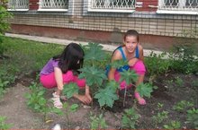 В школе работает трудовая бригада. Девочки и мальчики приводят в порядок школьный участок, поливают цветы.