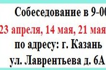 Собеседование в 9.00 23 апреля, 14 мая, 21 мая по адресу: г.Казань ул.Лаврентьева д.6А