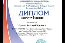 Ученицы 8А класса Злата и Каролина Ерзовы стали Лауреатами I степени в Республиканском конкурсе "Патриоты России!", посвященном 75-й годовщине Победы. Девочки, под руководством Чекалина А.Н. и Тухватуллиной Л.Р., отлично выступили в номинации "Художественное слово-дуэт".
