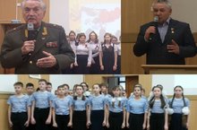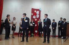 Интересным было выступление 6А класса, который занял 1 место в школе на смотре строя и песни (кл.руководитель Решетникова Александра Борисовна). Ребята, одетые в матросские тельняшки, исполнили показательный номер и песню "Морзянка". Песня была посвящена Ахату Гайнуловичу, который служил на Севере 6 лет.
