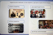Родительское собрание "О чем говорить с детьми в год 80-летия Победы". Советник директора по воспитанию, Губайдуллина Гузель Ришатовна, выступила на родительском собрании в онлайн режиме на тему: «Война. Победа. Память». Важные слова на все времена. В этом году мы отмечаем 80-летие Великой Победы. Поэтому важно и детям, и взрослым познакомиться с историей прошедшей войны из правдивых источников. С целью ознакомления с источниками советником по воспитанию было проведено родительское собрание «О чём говорить с детьми в год 80-летия Победы?» Родителям было предложено несколько ресурсов, благодаря которым можно найти информацию о родственнике — участнике Великой Отечественной войны. Есть ресурсы, где вместе с детьми можно посмотреть фильмы о прошедшей войне. В конце выступления, присутствующие родители ответили на несколько вопросов и выяснили глубину своих познаний о Великой Отечественной войне.
