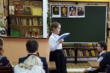 Шарипова Ф.М. познакомила всех зрителей с книгами-юбилярами. Прозвучал романс на стихи С. Есенина "Заметался пожар голубой" в исполнении учениц 10-го класса. В конце мероприятия ребята поучаствовали в викторине.