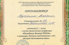 Поздравляем ученика 10 класса Бутылина Максима, занявшего 1-ое место в научно-практической конференции «Наследники Великой Победы» в номинации «История повседневности в годы войны». Руководитель: Ивашкевич И.М.