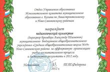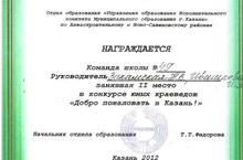 Педагогический коллектив (директор Бромберг А. Ш.) награждается ГРАМОТОЙ Отдела Управления образования Исполнительного комитета муниципального образования г. Казани по Авиастроительному и Ново-Савиновскому районам за эффективную организацию учебно-воспитательного процесса и достигнутые результаты в 2012 году.