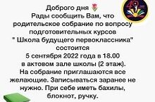 Рады сообщить Вам, что родительское собрание по вопросу подготовительных курсов "Школа будущего первоклассника" состоится 5 сентября 2022 года в 18:00 в актовом зале школы (2 жтаж). На собрании приглашаются все желающие. Записываться заранее не нужно. При себе иметь бахилы, блокнот, ручку.