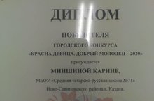 16 декабря состоялось награждение победителей и призёров городского этапа конкурса "Красна девица и Добрый молодец" 2020. От нашей школы приняла участие ученица 9б класса Миншина Карина. Она достойно показала свое мастерство, артистизм и стала победителем. Большую благодарность в подготовке ученицы к конкурсу выражаем Якуповой С.А.