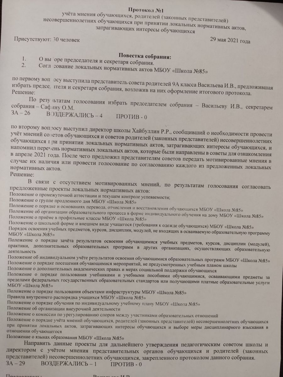 Учёт мнений обучающихся, родителей (законных представителей) несовершеннолетний обучающихся при принятии локальных нормативных актов, затрагивающих интересы обучающихся осуществляется в соответствии с установленной локальными нормативными актами процедурой: Протокол №1 от 29 мая 2021 года