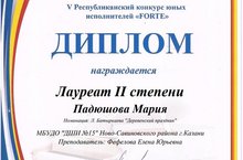 Поздравляем ученицу 1 Б класса Падюшову Марию, награжденную дипломами лауреата 2 степени в V Республиканском конкурсе юных исполнителей "FORTE" в номинациях Л.Батыркаева "Деревенский праздник", Е.Девис "Счастливый день". Желаем дальнейших творческих успехов!