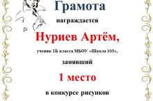 Поздравляем учеников 1Б класса Царева Владислава, Исакиева Владислава, Калинкина Артема, Газизов Самата, Бабкина Дмитрия, Смолякова Павла, Кордюкову Виолетту, Шишкову Дарью, Вяткину Кариму, награждённых дипломами за активное участие в конкурсе рисунков от районной библиотеки 45 "Территория хорошего настроения" в честь Международного дня защиты детей.