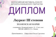 Поздравляем ученицу 3а класса Знаменскую Марию. Диплом лауреата 3 степени во Всероссийском конкурсе " Ритмы весны" в номинации " Эстрадный вокал"