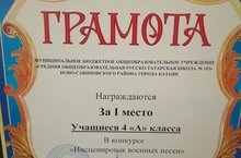 Учащиеся 4Б класса заняли 3 место в конкурсе "Инсценировка военной песни" в рамках мероприятий, посвященных празднованию Дня Победы. Поздравляем!
