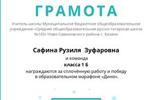 Ученики 1 б класса были награждены Грамотой от Uchi.ru за сплоченную работу и победу в образовательном марафоне Дино! Молодцы!