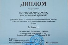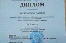 Поздравляем ученицу 4Б класса Васильеву Дарину и руководителя Мустафину Р.Р., награждённых дипломом за 2 место в Республиканском конкурсе "Заповедная природа Республики Татарстан" в номинации "Плакат".