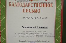 Учащиеся 4а класса награждены благодарственным письмом за активное участие в конкурсе рисунков и поделок по произведениям Фаниса Яруллина.