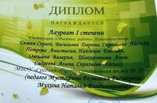 Поздравляем учеников 4Б класса: Семина Сергея, Васильеву Дарину, Сиразиеву Айсылу, Найденова Евгения, Шакирзянову Алию, Садрееву Алину, Петрову Анастасию, Оюшину Валерию и их руководителей: Мустафину Р.Р., Мухину Н.В. , которые награждены Дипломом лауреата I степени в V Городском экологическом фестивале творческих коллективов "Зелёная планета"!