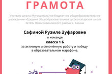 Комада 1 Б класса награждена Грамотой за активную и сплоченную работу и победу в образовательном марафоне Uchi.ru