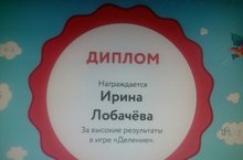 Ученица 2А класса Лобачёва Ирина награждена дипломом за высокие результаты в игре «Деление». Поздравляем!