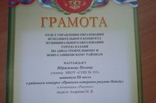 Ученица 3 в класса Ибрагимова П.(кл. рук-ль: Андреева М. В.) награждена Грамотой Управления Образования по Ново-Савиновскому району г. Казани занявшую 3 место в районном конкурсе " Правнуки ветеранов рисуют победу"в номинации " Рисунок". Поздравляем!