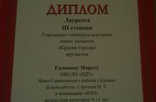 Грамотой Управления Образования награжден ученик 3 в класса Галимов М! В городском конкурсе - выставки юных талантов "Краски города" награжден Грамотой Лауреат lll степени в номинации ИЗО. Поздравляем!!!