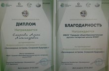 Учитель биологии - Смирнова А.А. награждена дипломом ЭкоЦентра "Заповедники" за проведение Всероссийского заповедного урока в 8 классе на тему: "Заповедные острова. Сохраняя будущее", а школа №103 награждена благодарственным письмом.