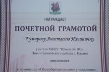 Поздравляем Анастасию Ильиничну ! Она награждена Почетной Грамотой Отделом Образования Ново- Савиновского района за участие в районном этапе городского конкурса вокальных дуэтов " Две звезды"(по линии профкома).