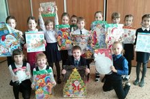 Ученики 2А класса приняли активное участие в акции "Новогодняя шкатулка", предоставив витражи для украшения стен школы.