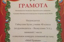 Ученик 4 В класса Гайнуллин Б. участвовал в школьном конкурсе сочинений "Мой Пушкин" и награжден грамотой за 1 место