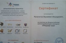 Поздравляем ученика 2 в Музагитова М. (кл. рук-ль: Андреева М. В.), он награжден Сертификатом за участие во Всероссийском метапредметном конкурсе "Решай-ка".Молодец! -