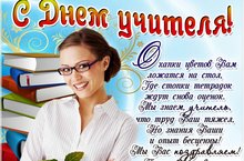 Поздравляю вас с замечательным всенародным праздником -Днем Учителя! Благодарю вас за каждодневную добросовест- ную работу, за титаническую выдержку и терпение, за стремление идти всегда вперед невзирая ни на какие трудности! Желаю вам здоровья на долгие-долгие годы, благополучия и успехов в благородном труде, оптимизма и бодрости духа! Пусть каждый урок, каждая встреча с ребятами дарят вам радость и вдохновляют на творчество!