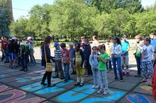 C высоко поднятыми флагами (конкурс отрядных уголков), дети шагнули вперед. Здесь дети побывали в гостях у самого интересного сказочника, который как никто другой умел своим талантом гипнотизировать, что все как один слушали, смеялись над рассказами... (театр одного актера, с выездом, А.Носов).А еще их ожидали увлекательные испытания (спортивно развлекательные игры под руководством нашей умелой волшебницы-учителя физкультуры Лукъяновой Л.М.). Здесь проверялся и командный дух (командные кричалки), и быстрота (эстафета), и внимание, и многое другое. Игры эти были дружескими, они сплотили наши отряды и сейчас отряды готовы идти дальше. Кидаем кость, и нам она показывает 4. Что? "Нарисуй музыку, затем перепрыгни ее?" Ничего пока не ясно, что же, интересно, ждет наших ребят...