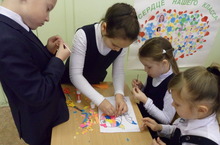 В 3б классе (кл. рук. Мухина Н.В.) в рамках акции «Безопасные формы поведения» было проведено занятие «Рыбки дружбы». Ребята в процессе совместной работы создавали панно. Чтобы работа получилась аккуратной, они должны были договориться, выполнять задание четко, слаженно. Так в классе появился «аквариум».