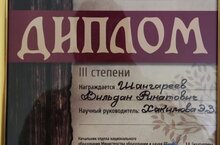 Призёр Республиканской Краеведческой конференции исследовательских работ по истории и культуре кряшен «Ыру агачы» ученик 10 класса, Шангареев Вильдан. Руководитель: учитель истории Хакимова Э.З.