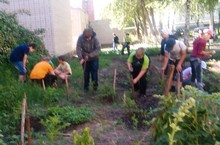 Учащиеся школы проходят учебно-производственную практику на пришкольном участке под руководством Т.К.Шлычковой.Они поливают цветы и пропалывают цветочные грядки.