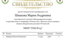 Ученик 7б класса Найденов Евгений получил диплом 1 степени в Международном конкурсе по русскому языку и литературе "Олимпис 2022 - Весенняя сессия". Учитель : Шмакова М.А.